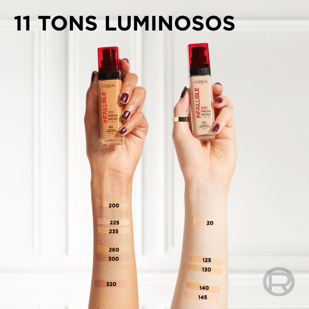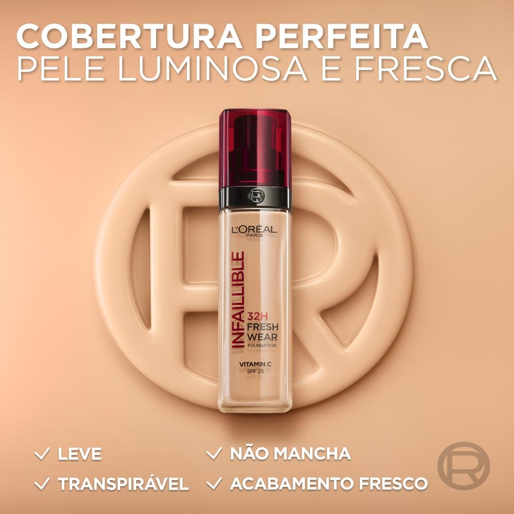 Base de maquilhagem Infaillible 32H Freshwear de L'Oréal Paris: acabamento leve, graças à formula de longa duração, enriquecida com Vitamina C.