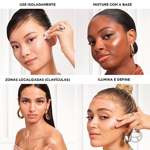 Três formas diferentes de aplicação: obter um efeito de brilho total quando aplicado sozinho, um brilho suave quando aplicado antes da sua base favorita, ou um brilho localizado quando aplicado depois da base como um iluminador.